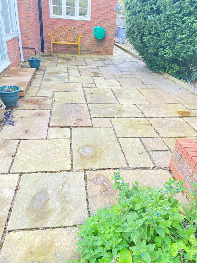 Before and after pictures of a driveway completed in earlswood, with a tobermore charcoal border and step topped with a Cotswold stone finish.